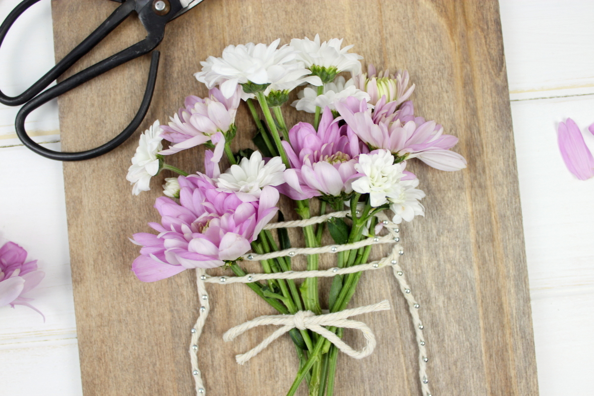 - Zum Schluss fehlen noch die Blumen. Für das Bild habe ich frische Blumen verwendet und diese mit einer kleinen Schleife an den Stielen zusammen gebunden. Diese halten natürlich nur ein paar Tage. Wer es immer schön haben möchte, sollte unechte Blumen verwenden.