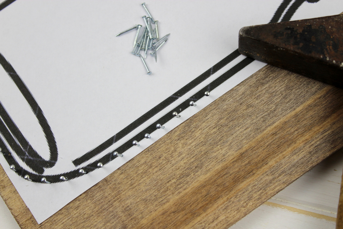- Wenn alle Nägel im Holz sind, könnt ihr die Vorlage vorsichtig abmachen. Dazu einfach das Papier Stück für Stück von den Nägeln abziehen.