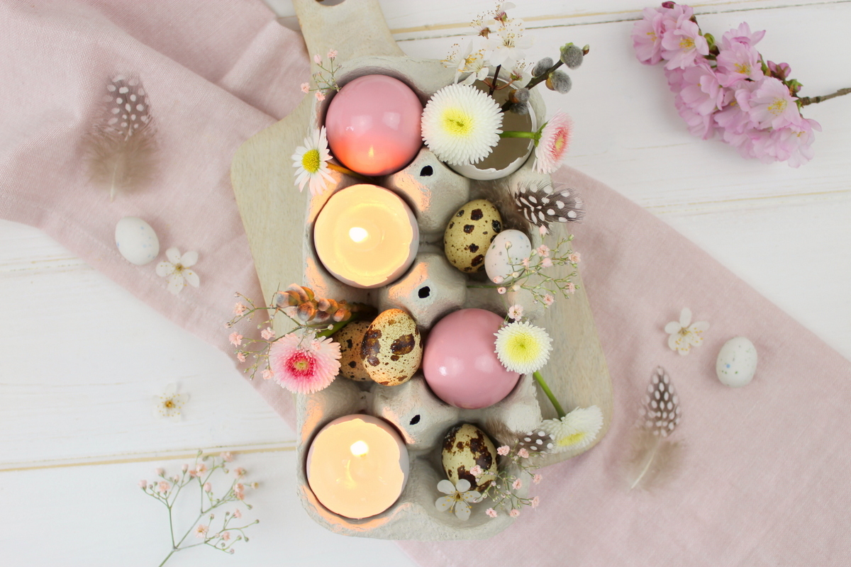 8. Zu Guter Letzt geht es ans Dekorieren. Legt dazu eure Eier in einen Eierkarton, befüllt diesen mit euren besprühten Ostereiern, füllt die kleinen Ostereiervasen mit frühlingshaften Blumen und zündet eure Kerzen in Eierschalen an. 🙂