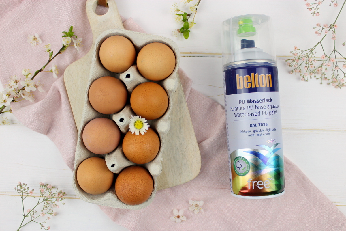 5. Nun geht es ans Besprühen der Eier. Sprüht eure Eier in einem Abstand von ca. 20-30 cm an. Passt auf, dass sie dabei nicht wegrollen, da sie wirklich sehr leicht sind. 🙂 Ich habe Handschuhe getragen und sie von innen festgehalten. Zum Besprühen habe ich den belton® free PU Wasserlack in der Farbe lichtgrau verwendet. Wenn ihr eure Eier besprüht habt, lasst diese gut trocknen. Mit dem belton free® ist die Farbe nach 45 Minuten staubtrocken und dann kann es auch schon mit der Bearbeitung der Eier weitergehen!DIY selbstgemachte Osterdeko / Ostereier Kerze / Ostereier Vase und angesprühte Ostereier