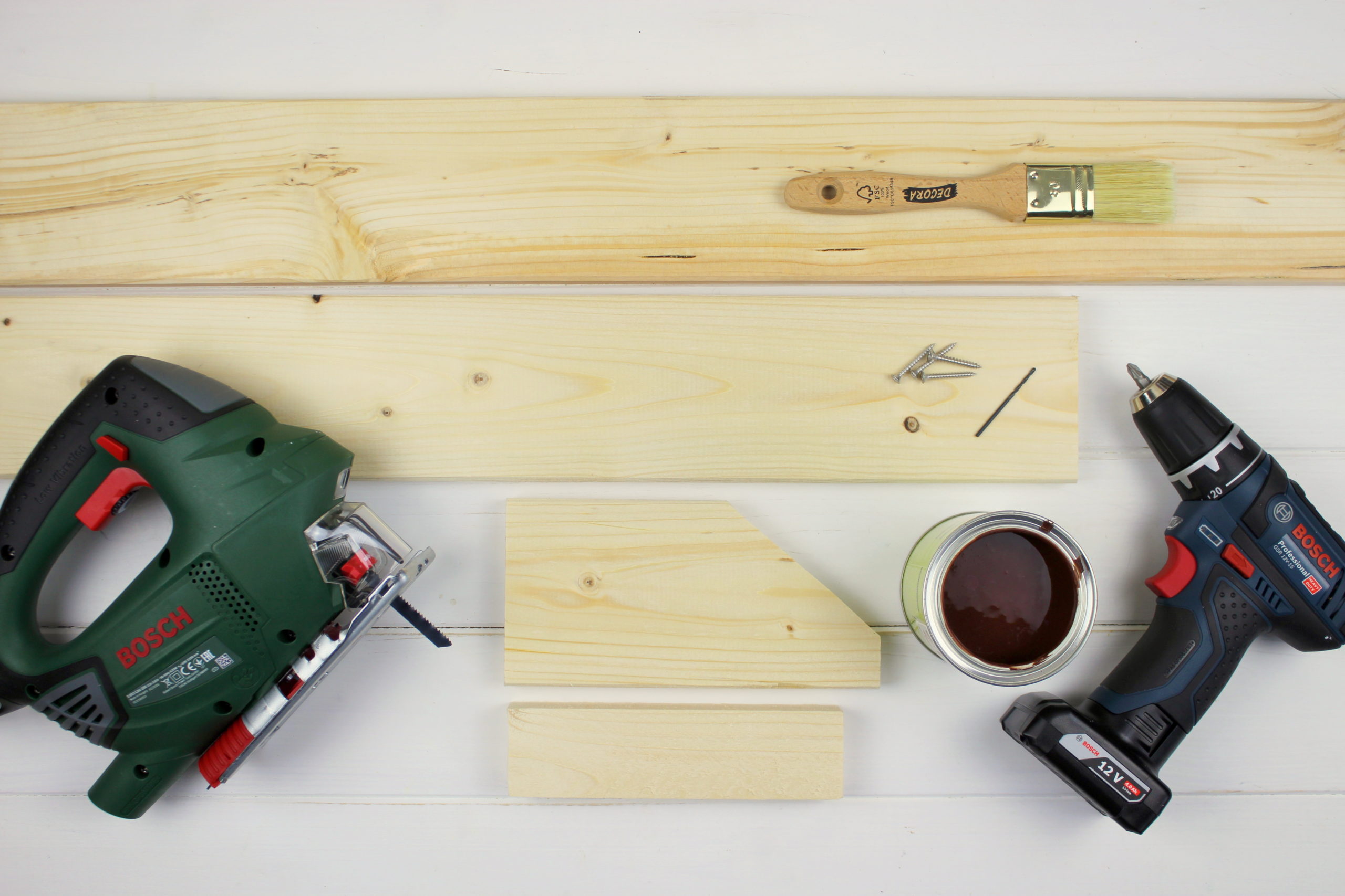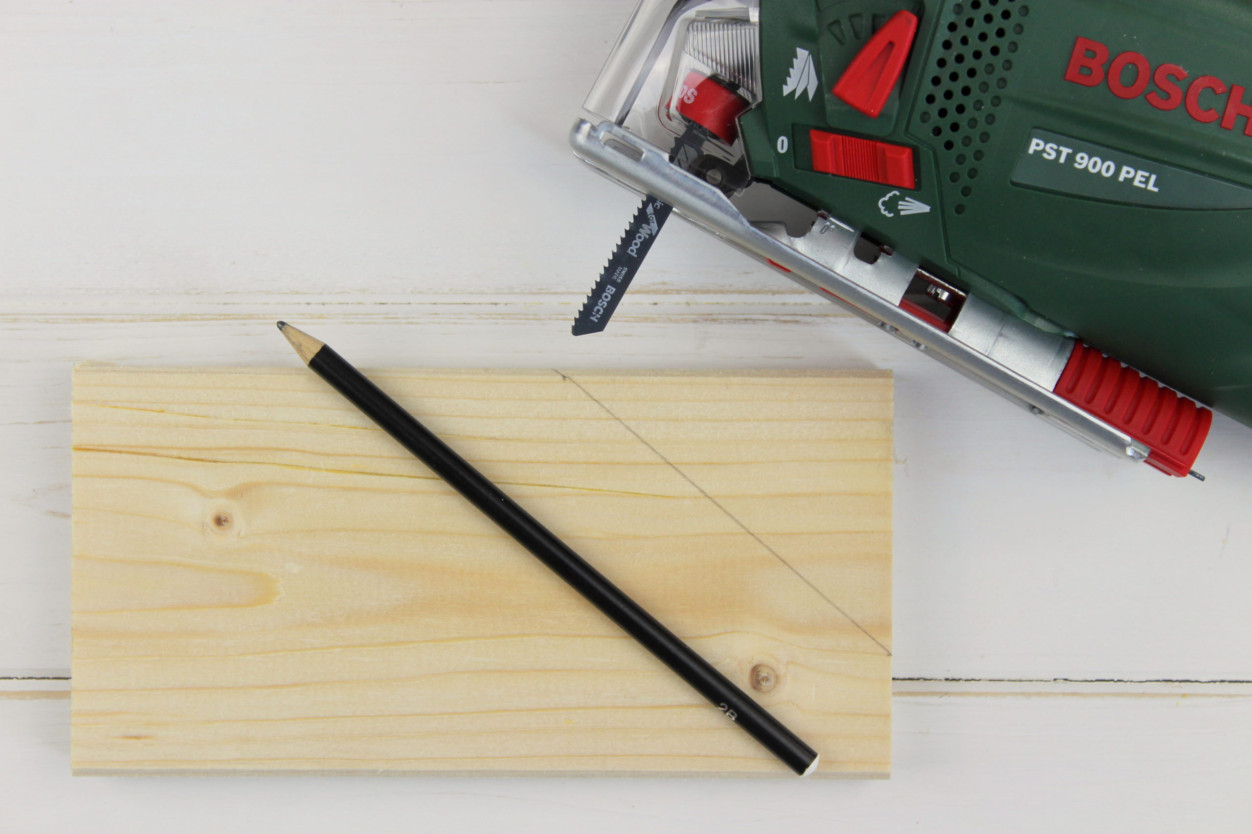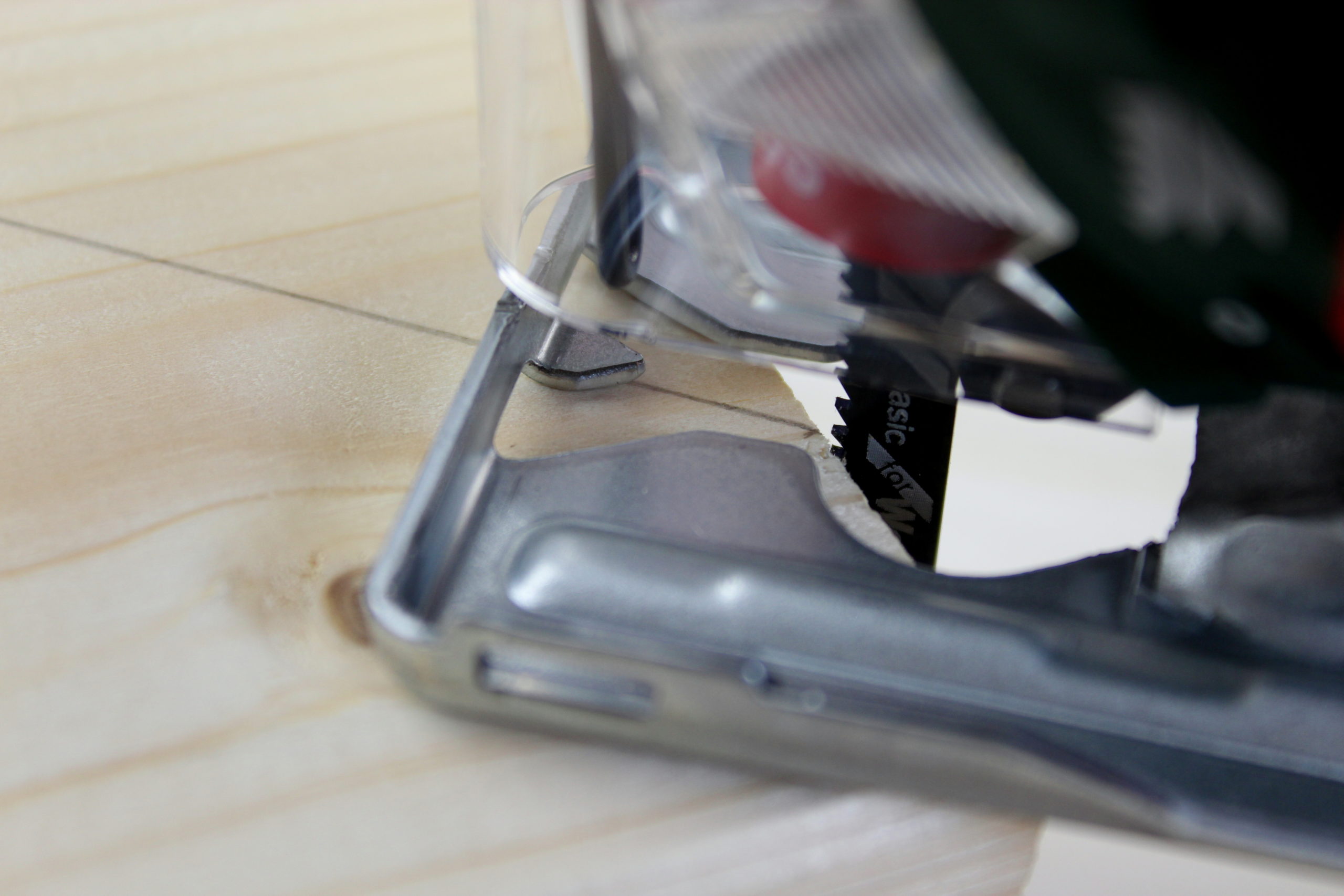 - Sägt dann mit Hilfe einer Stichsäge an der Bleistiftlinie entlang. Glättet die scharfen Kanten mit Holzschleifpapier. Ich verwende gerne feines Schleifpapier mit einer Körnung von 120 oder 240.
