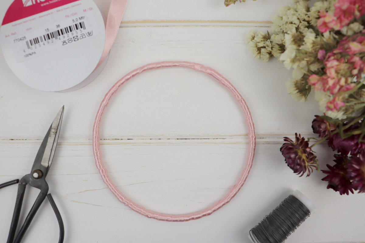 - Umwickelt zuerst euren Draht mit Satinband.