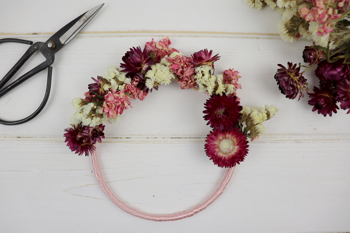 - Nun brauchen wir Trockenblumen und Bindedraht. Nehmt euch zuerst 2-3 Blumen, legt sie auf den Drahtringe und umwickelt die Blumen dann mehrmals mit dem Bindedraht.