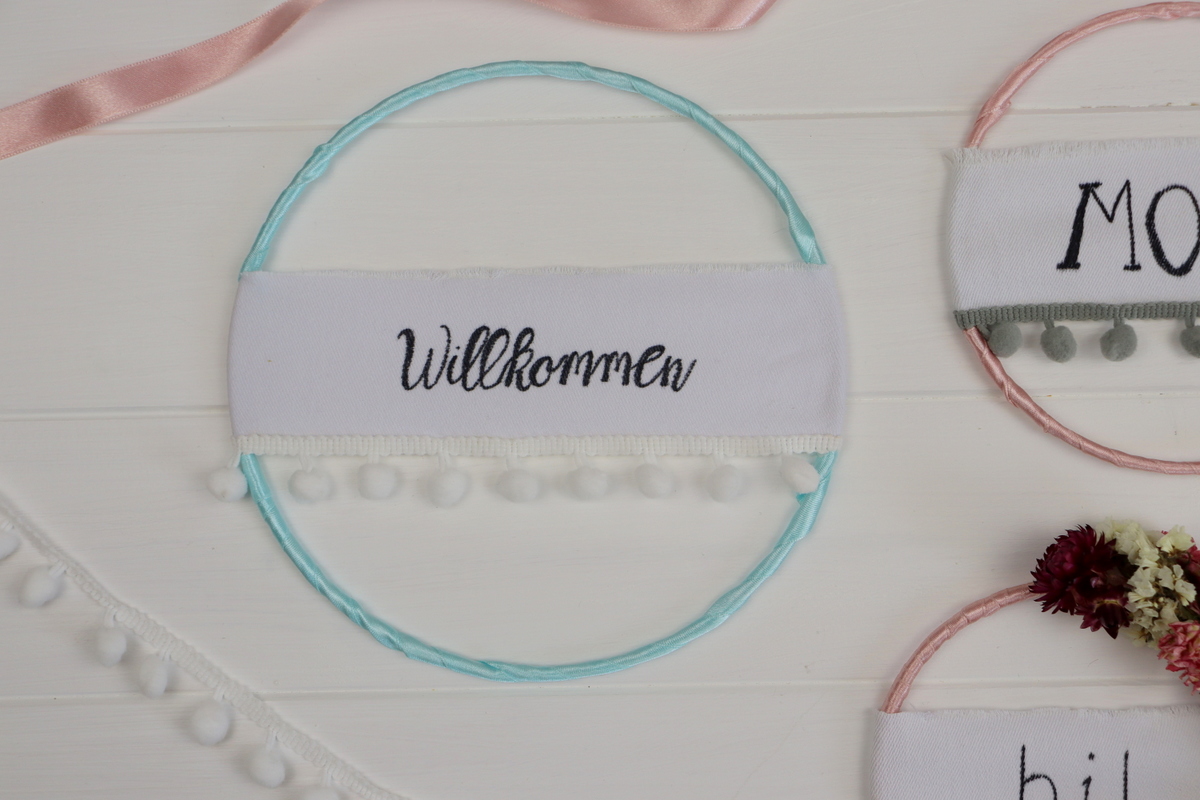 - Dann habe ich ebenfalls Stoff beschriftet und dieses mit Heißkleber an dem Ring befestigt.