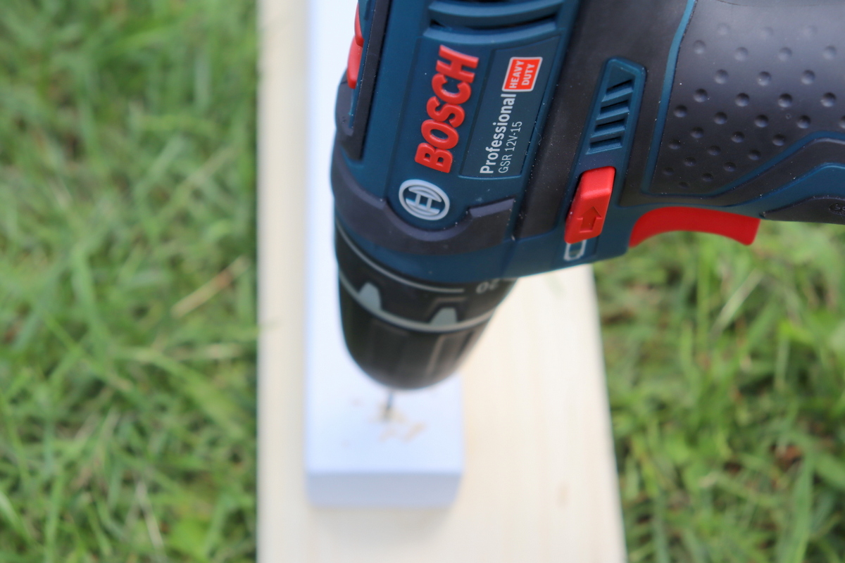 - Bohrt dann mit eurem Holzbohrer in die Enden der Kanthölzer jeweils ein Loch. Ich habe 2 cm vom Rand und mittig vom Kantholz das Loch gesetzt. Ich bohre immer alle Löcher vor, auch hier habe ich jedes Loch vorgebohrt. So fällt mir das Verschrauben einfacher!
