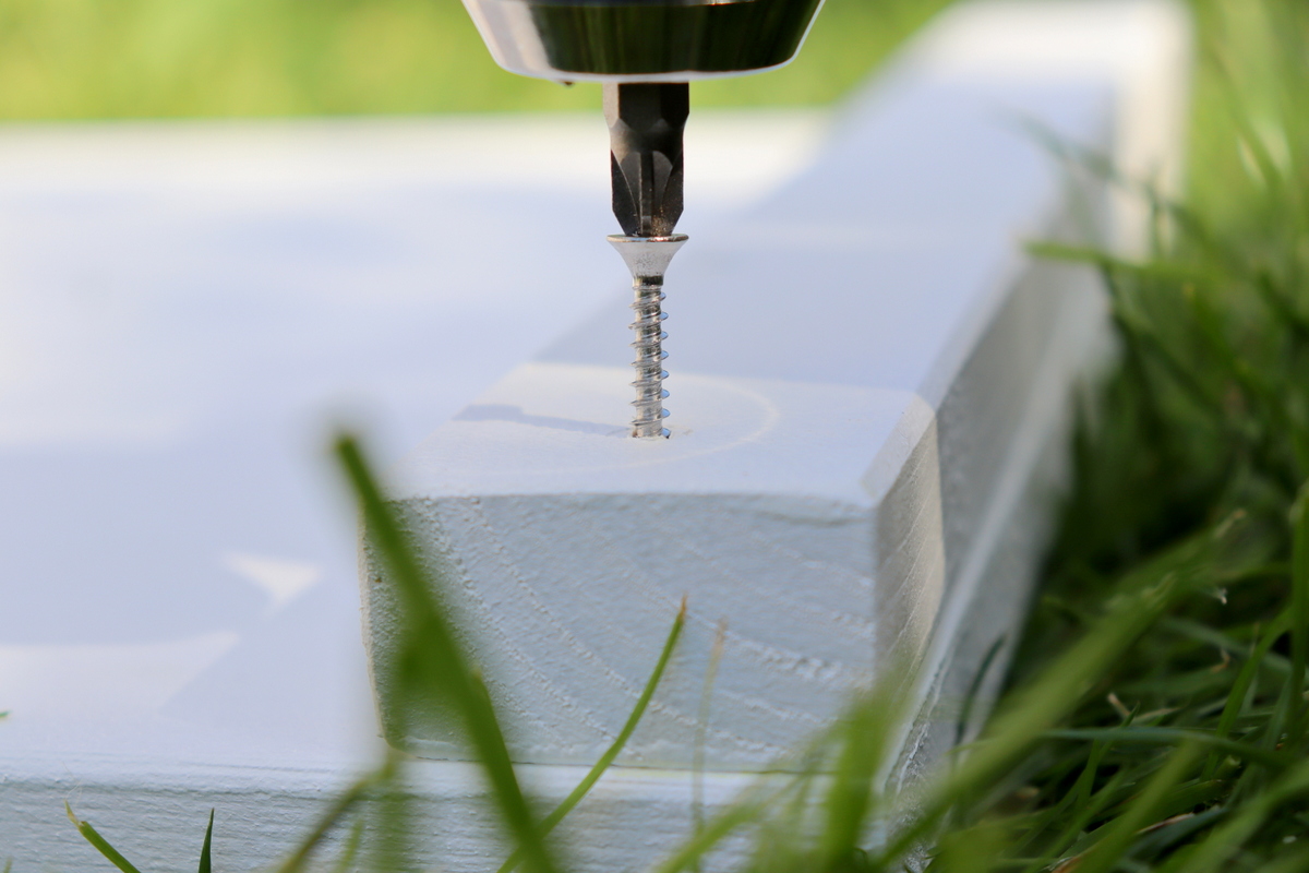 - Danach legt ihr dieses Kantholz auf die 4 Bretter und verschraubt die Enden jeweils mit den Brettern.