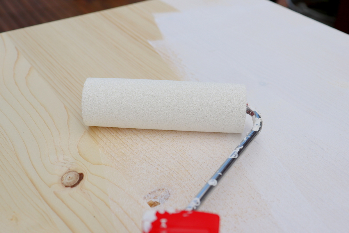 4. Wenn ihr alle Teile zurecht gesägt und geschliffen habt, geht es auch schon ans Malen. Ich habe mich für weiße Gartenmöbelfarbe entschieden und diese mit einer Schaumstoffrolle aufgetragen. Lasst dann alles gut trocknen.DIY - selbstgebaute Gartenbank mit Blumentopf
