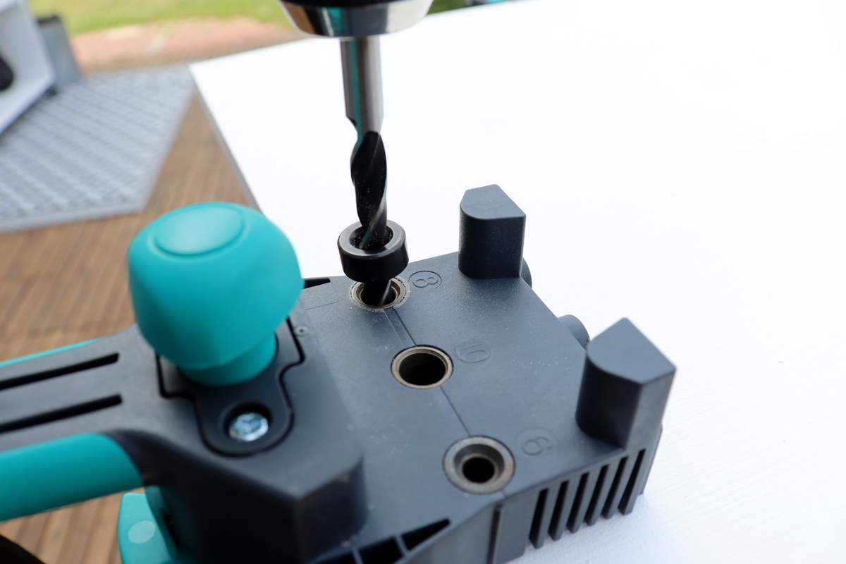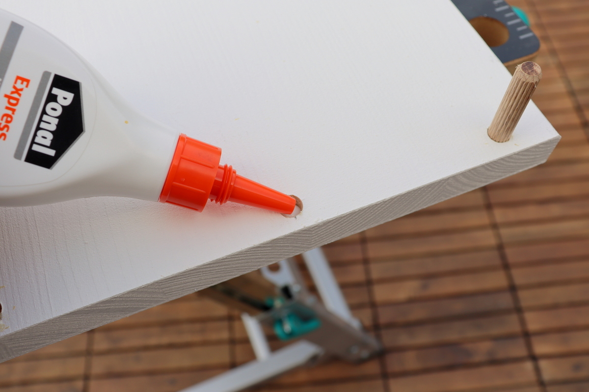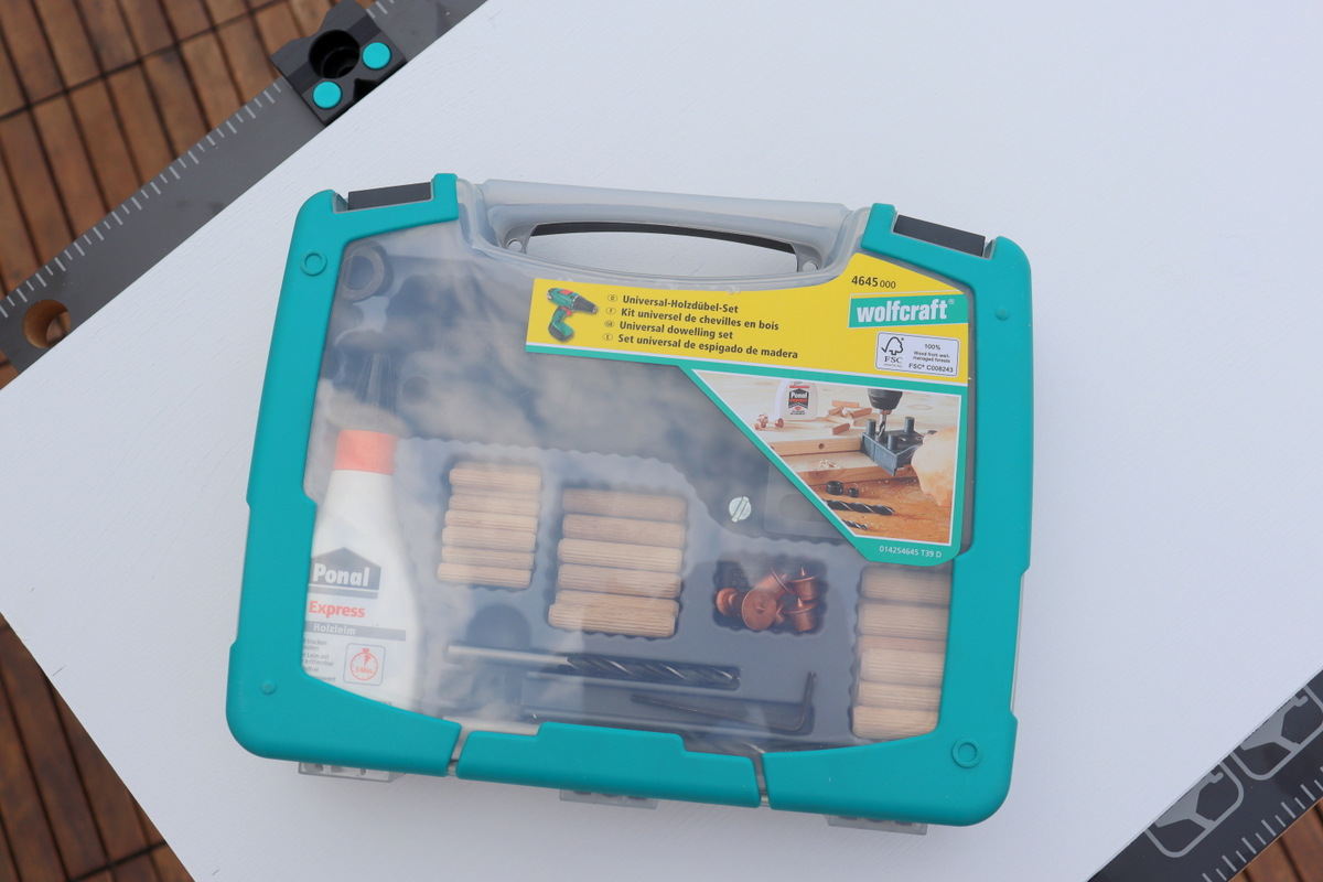 5. Bei der Gartenbank wollte ich nicht, dass man Schrauben sieht, deswegen wollte ich unbedingt mal ausprobieren, Holzdübel selber zu setzen. Dazu habe ich den Meisterdübler und das Dübel-Set von wolfcraft® verwendet und es war wirklich super einfach. DIY - selbstgebaute Gartenbank mit BlumentopfBegonnen habe ich bei meiner 140×40 cm Platte. In diese Platte habe ich insgesamt 5 Dübel gesetzt. Ich habe mich für 8 mm Dübel entscheiden. Dazu habe ich abgemessen, wie tief ich in meine Platte bohren kann und dieses Maß habe ich dann mit dem Tiefenstopp eingestellt. DIY - selbstgebaute Gartenbank mit BlumentopfDanach brauchte ich nur noch durch die Führung im Meisterdübler bohren. Total easy. Das gleiche habe ich mit dann mit meiner 40×38 cm Leimholzplatte gemacht. Man sollte hier nur genau darauf achten, dass man ganz genau misst, ansonsten passen die Stücke später nicht zusammen.
