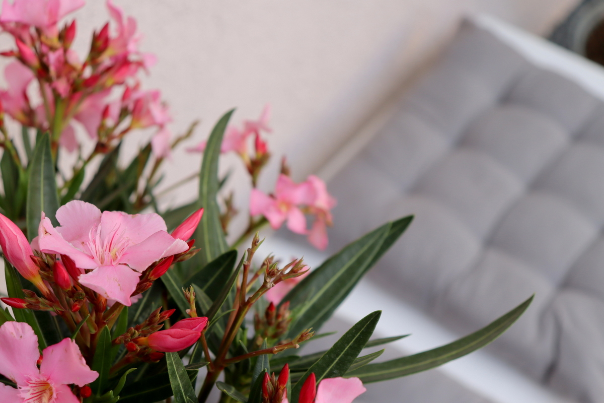 7. Nun fehlt aber noch ein kleiner Baum oder eine Pflanze. Ich habe mich für einen Oleander in meiner Lieblingsfarbe entschieden, diese blühen im Moment so wunderschön. Nachdem der Oleander eingepflanzt war, habe ich auf die Erde dann noch ein paar Zierkiessteine gelegt.