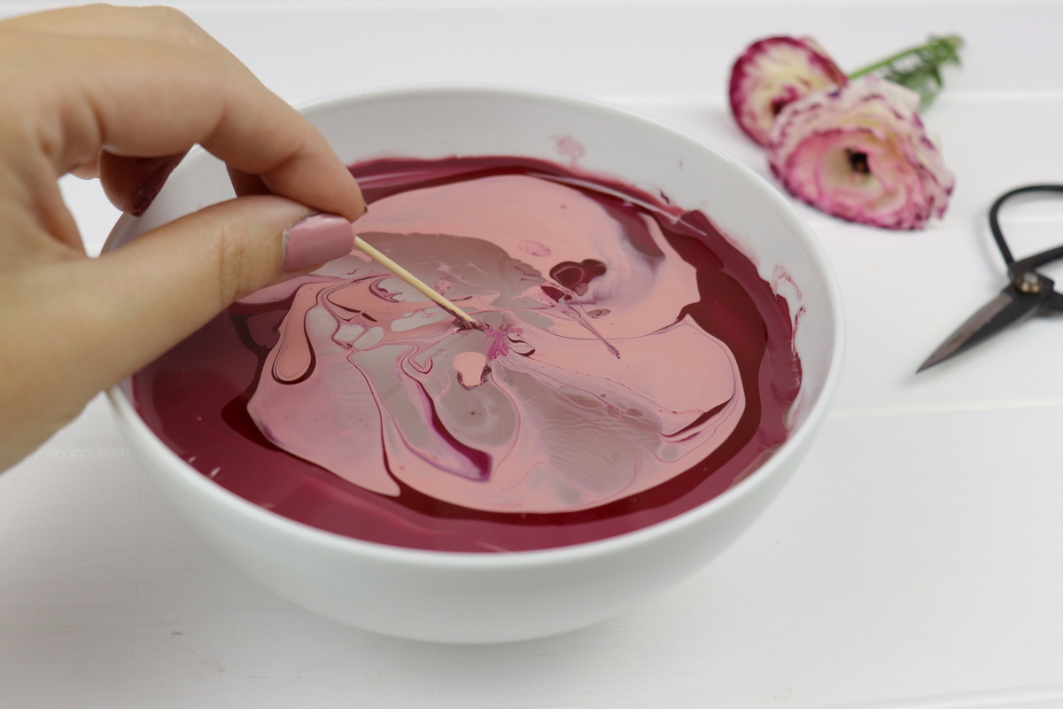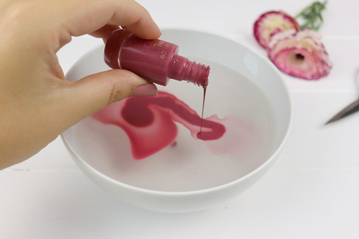 - Gebt dann zügig euren Nagellack in die Schüssel. Besonders schön sieht es aus, wenn ihr 2-3 Farben mischt.