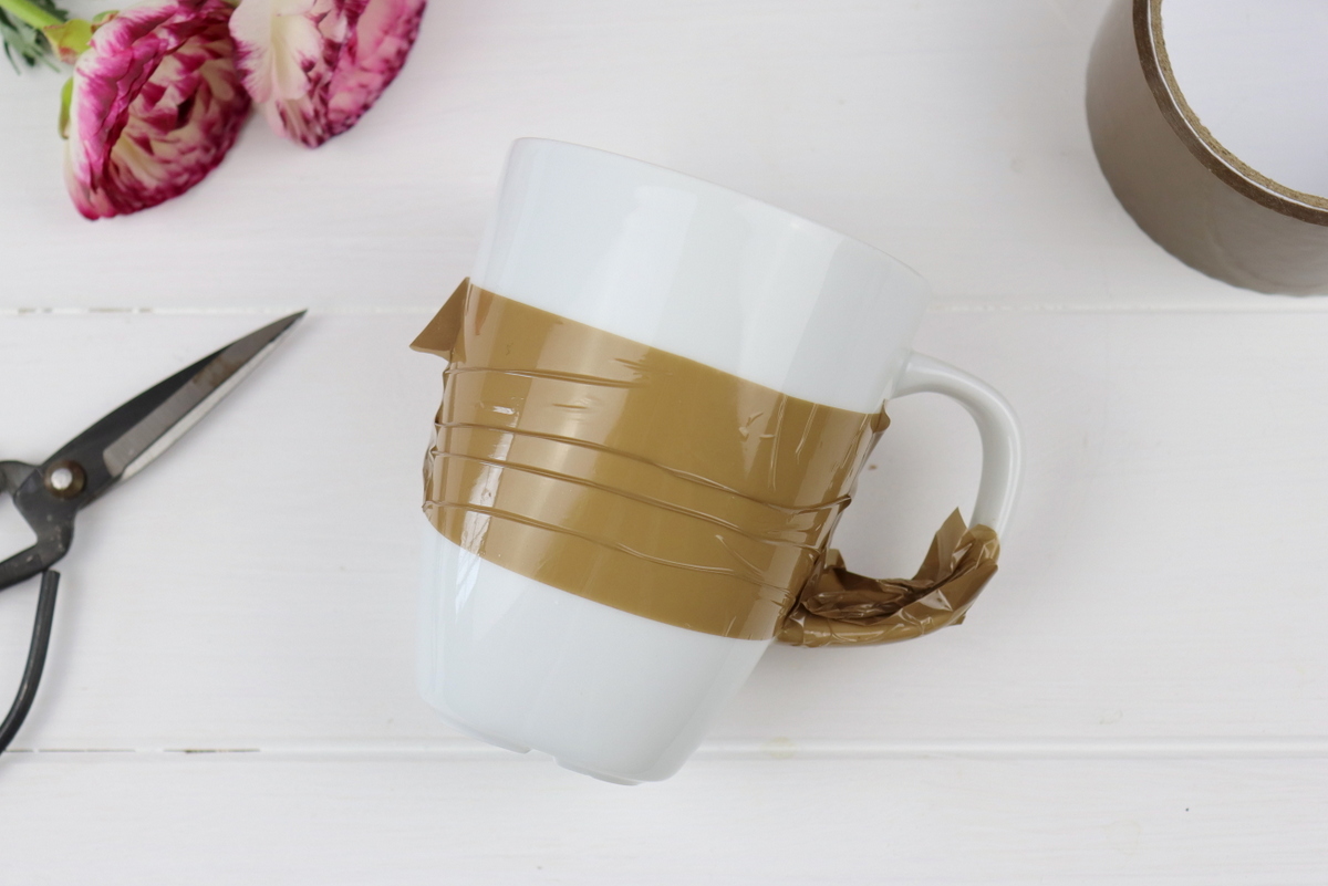 - Als erstes solltet ihr euren Becher vorbereiten, klebt dazu den Bereich, den ihr marmorieren wollt mit Paketband ab. Ich habe viele Abklebebänder probiert. Für mich hat es am besten mit Paketband funktioniert. Es ist wasserabweisend und klebt so fest, dass kein Nagellack unters Band laufen kann.