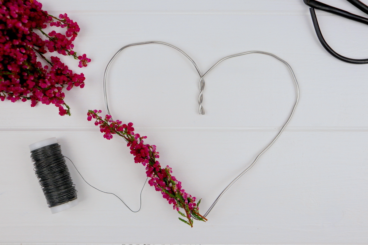 2. Schneidet euch ein paar Blüten von eurer Erika ab. Legt dann eine Blüte am unteren Ende des Herzens auf den Draht und umwickelt diese 2-3 mal mit dem feinen Bindedraht.