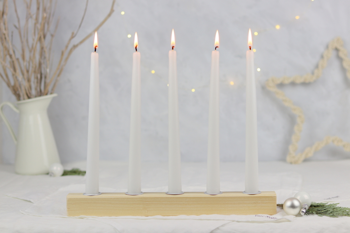 - Überlegt euch wie viele kleine Metall Kerzenhalter im Holz platzieren möchtet. Damit es nicht zu sehr wie ein Adventskranz aussieht, habe ich mich für 5 Kerzenhalter entschieden. Wie gesagt, ich möchte meinen das ganze Jahr über stehen lassen. 🙂