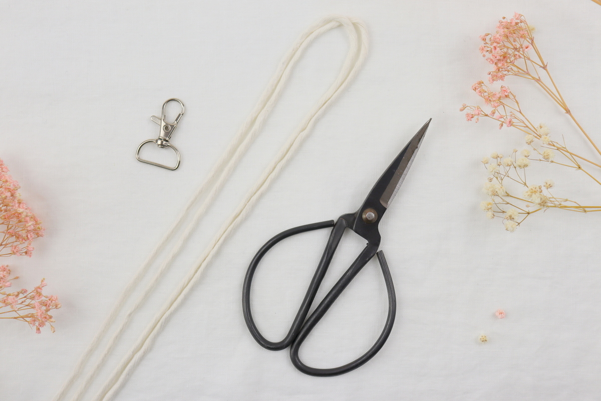 - Schneidet euch zunächst euer Makramee Garn zurecht. Für den Schlüsselanhänger braucht ihr 2x 80 cm Makramee Garn.