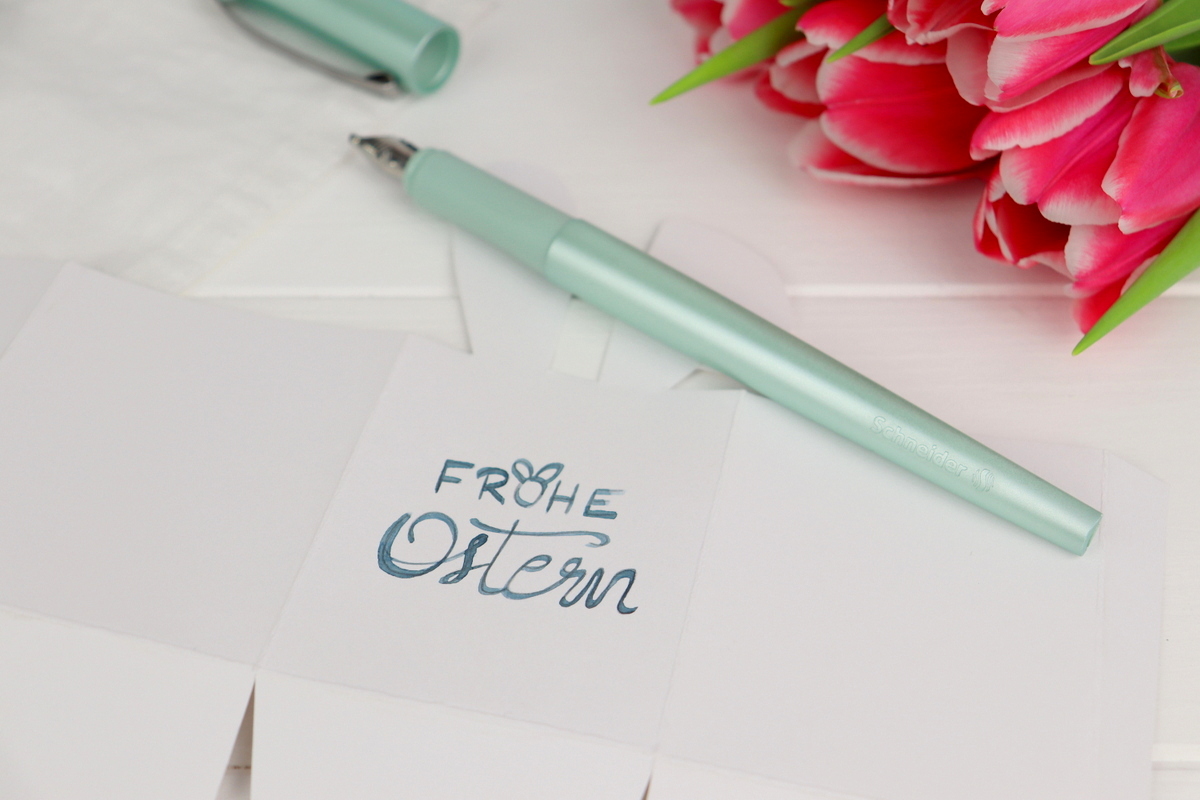 Damit ihr euch auch so süße kleine Geschenkverpackungen selber machen könnt, habe ich euch wieder ein kleines kostenloses Schnittmuster erstellt. Verziert habe ich die kleinen Boxen mit dem Kalligrafie-Füller Callissima und der Pastell-Tinte von Schneider. Als ich das erste mal den Callissima und die Pastell-Tinte gesehen habe, war ich gleich hin und weg. Den Callissima gibt es übrigens in zwei Farben in Mint und Apricot.