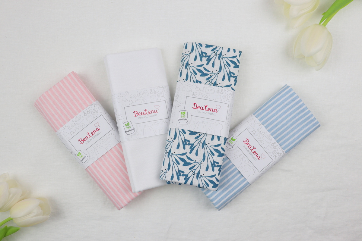 - Stoff rosa-gestreift, blau-gestreift, weiß, floral (Blätter)