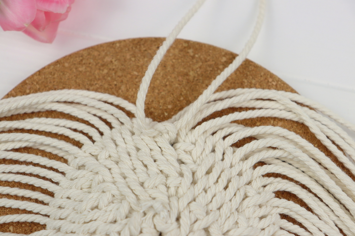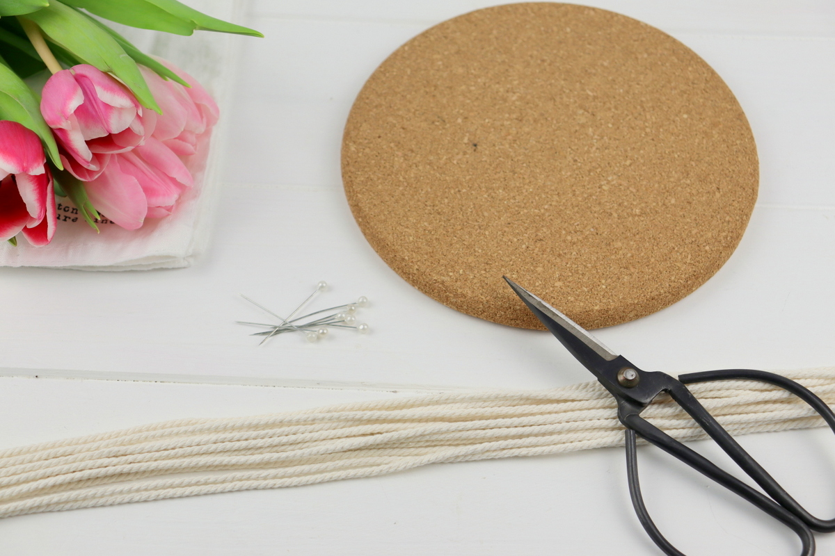 10. Wenn ihr das habt, befestigt euren Makramee Untersetzer wieder mittig mit Stecknadeln auf euren Korkuntersetzer. So könnt ihr euer überschüssiges Garn abschneiden ohne schief zu schneiden.DIY selbstgemachte Makramee Untersetzer / Macrame Coaster