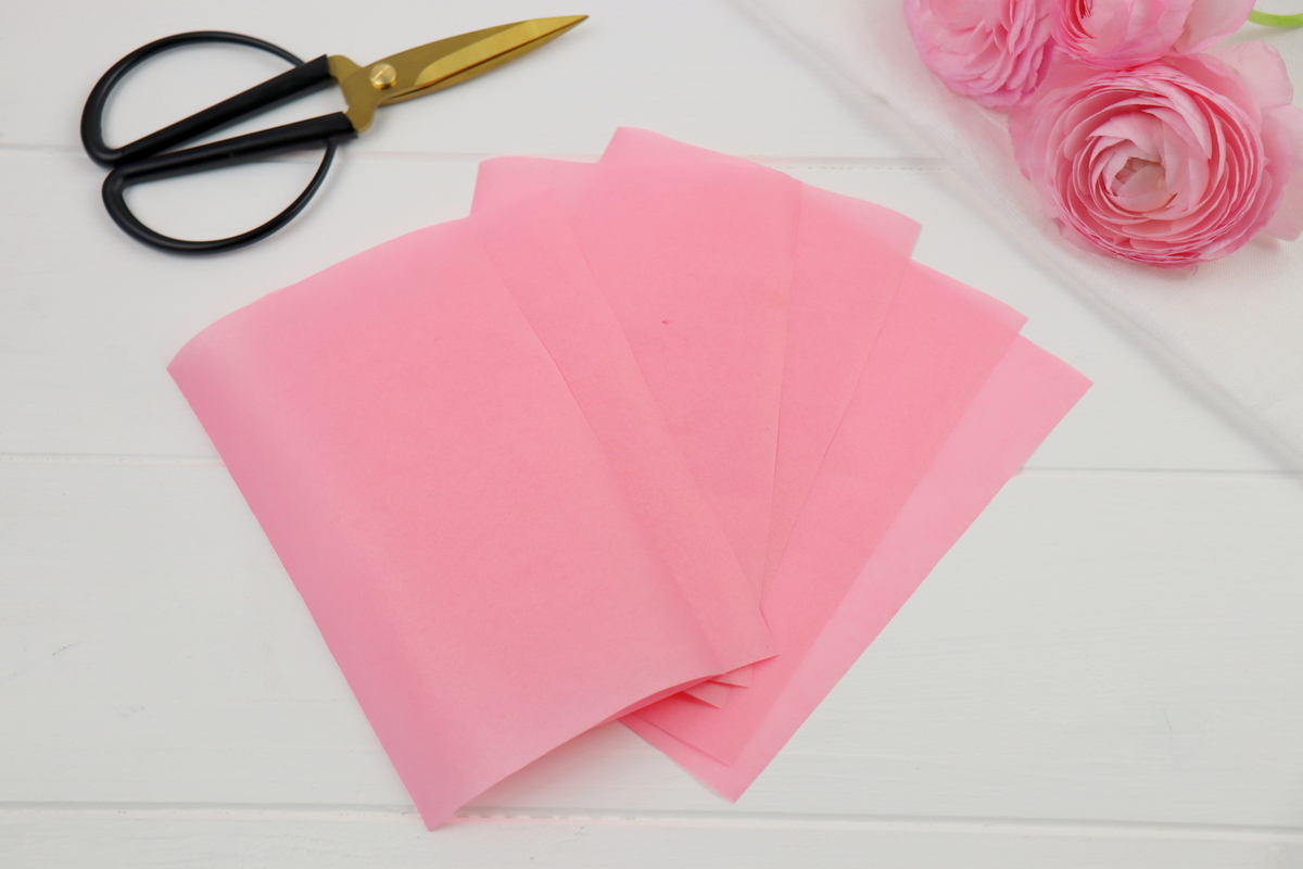 - Erstellt euch zunächst eine Vorlage aus dickerem Papier. Meine hat die Maße 9×15 cm. Je nachdem wie groß oder klein ihr eure Blumen haben wollt, könnt ihr die Vorlage anpassen. Übertragt diese dann auf eure Blumenseide. Pro Blume brauchen wir 6x die Vorlage aus Blumenseide ausgeschnitten. Das Schöne an dieser Blumenseide ist, dass sie bereits 6 lagig aufgerollt ist. So brauchte ich die Vorlage nur einmal übertragen, ausschneiden und hatte gleich Papier für eine Blume. Arbeit gespart. 🙂