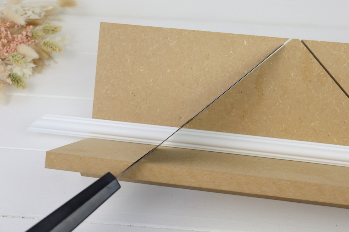 - Dazu habe ich sie in die Gehrungslade gelegt und mit der Säge für Stuckleisten zurecht gesägt. Von diesen Stuckleisten brauchen wir jetzt 8 Stück. Diese sollten an der langen Seite ein Maß von 28 cm und an der kurzen Seite ein Maß von 23,5 cm haben, außer ihr wählt natürlich eure eigenen Maße. Scharfe Kanten kann man wenn nötig mit etwas Schleifpapier glätten.