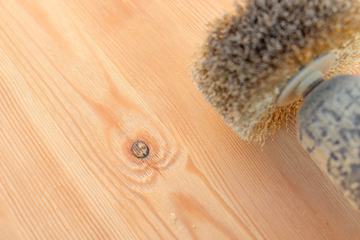 - Vor ein paar Wochen habe ich mir eine Holz-Struktur-Bürste zugelegt mit der kann man Holz altern lassen. Genau das wollte ich auch mit dem Deckel der Kommode machen. Dazu spannt man einfach die Holz-Struktur-Bürste in einen Akkusbohrer oder in eine Schlagbohrmaschine ein und geht entlang der Maserung über das Holz. So entstehen kleine Rillen und gerade Astlöcher werden wunderbar herausgearbeitet. WICHTIG! Macht sowas nicht im Haus oder in der Wohnung. Dabei entsteht sehr viel Späne und damit meine ich wirklich sehr viel. 😀 Passt auch auf, dass eure Finger nicht in die Bürste kommen.