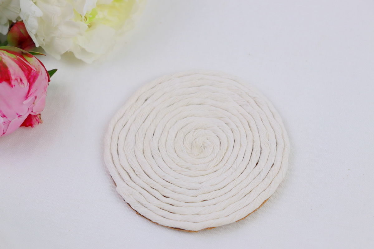 4. Nun habe ich die Korkplatte nach und nach mit etwas Klebstoff beklebt und das Makramee Garn kreisförmig auf die Korkplatte gelegt. Da Der Kleber nicht mehr verfügbar ist, habe ich euch oben einen ähnlichen verlinkt. Ich habe dazu Makramee Garn in 3 mm verwendet. Startet dabei außen auf der Platte. Anfänglich war meine Platte noch gewölbt. Das gibt sich aber sobald das Garn komplett auf der Platte liegt. Tipp! Falls ihr zu große Lücken zwischen dem Garn habt, könnt ihr dieses auch ein wenig aneinander kleben.