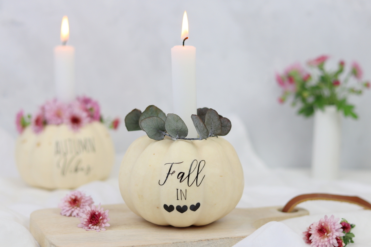[Werbung für Cricut] Nachdem ich euch vor ein paar Wochen meine selbstgemachte Vase aus einem Kürbis gezeigt habe, kommt jetzt noch eine wundervolle Herbstidee mit Kürbissen. Ich habe für euch eine Anleitung geschrieben, wie ihr aus einem Kürbis einen wunderschönen Kerzenhalter selber machen könnt.