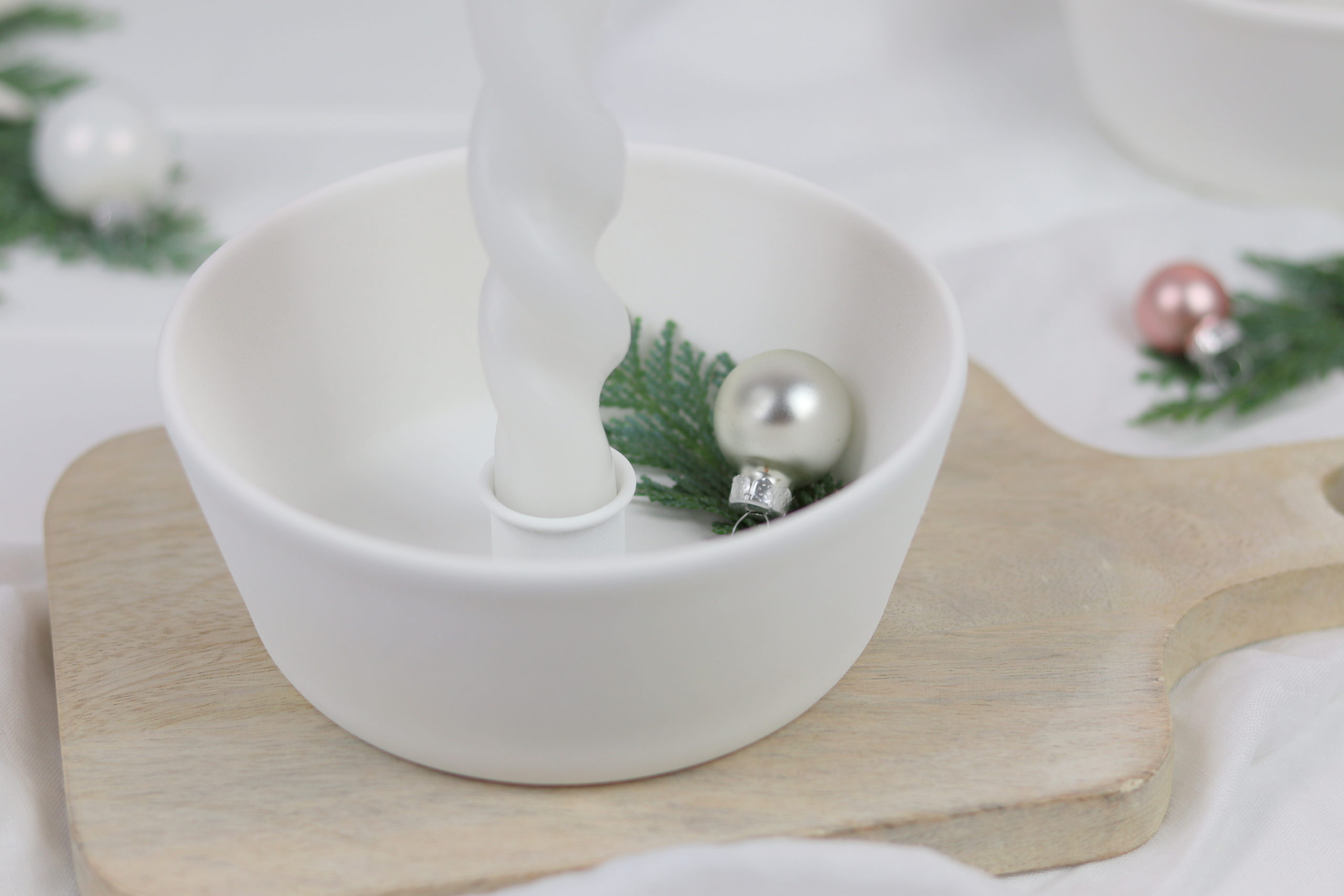 - Besprüht eure Schüssel dann mit Sprühfarbe. Ich habe Kreidefarbe zum Sprühen in weiß verwendet, da ich diesen matten Look einfach liebe. Lasst dann wieder alles gut trocknen.