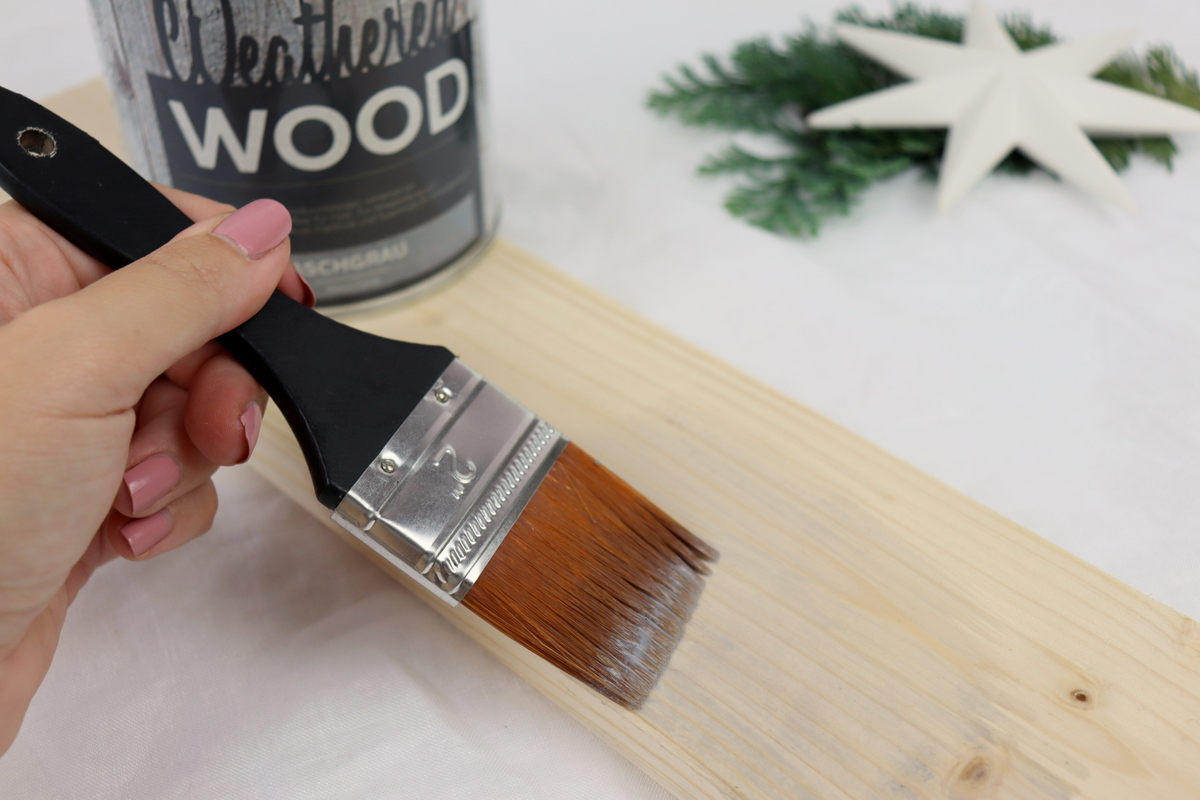 - Nun geht es ans Streichen. Rührt dazu die Weathered Wood Farbe gründlich durch. eure Euer Holz sollte unbehandelt, trocken, sauber und staubfrei sein. Wenn euer Holz gewachst oder geölt ist, muss dieses vorher mit Waschbenzin gereinigt werden. Die Farbe könnt ihr dann entweder mit einem Pinsel in Holzfaserrichtung oder mit einer kurzen-mittellangen Mohair-Rolle auftragen. Ich habe das Holz insgesamt 4x gestrichen. Ihr könnt die Farbintensität steigern je öfter ihr es streicht.