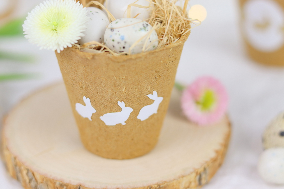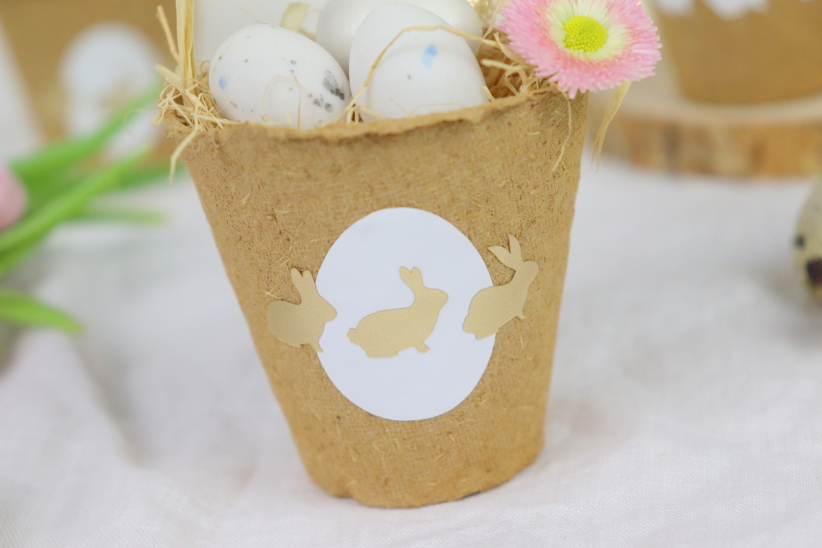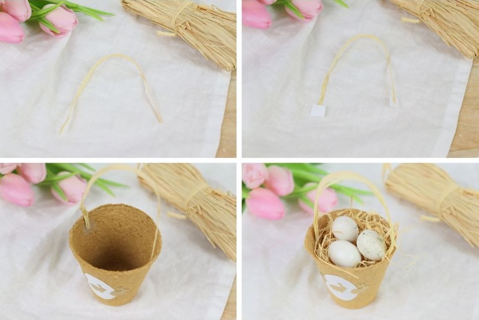 - Als nächstes soll unser Aufzuchtstopf zu einem Osterkörbchen werden. Nehmt euch dazu euer Naturbast, schneidet ein Stück ab und beklebt die Enden mit doppelseitigem Klebeband. Die Enden befestigt ihr dann innerhalb des Aufzuchtstopfes. Befüllt dann den Topf mit Ostergras und Eiern und fertig sind eure Osterkörbchen.