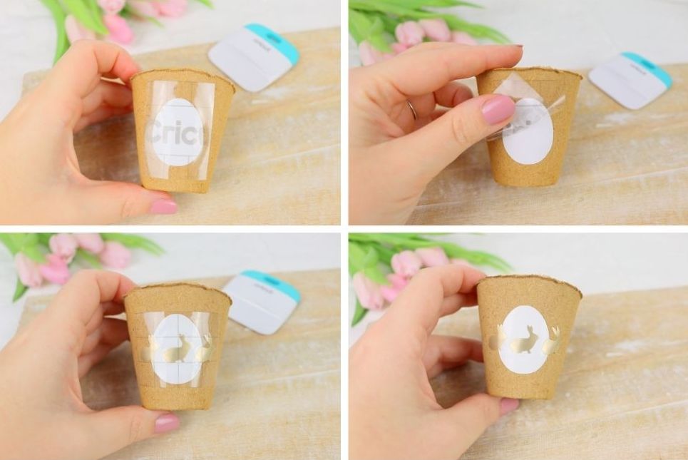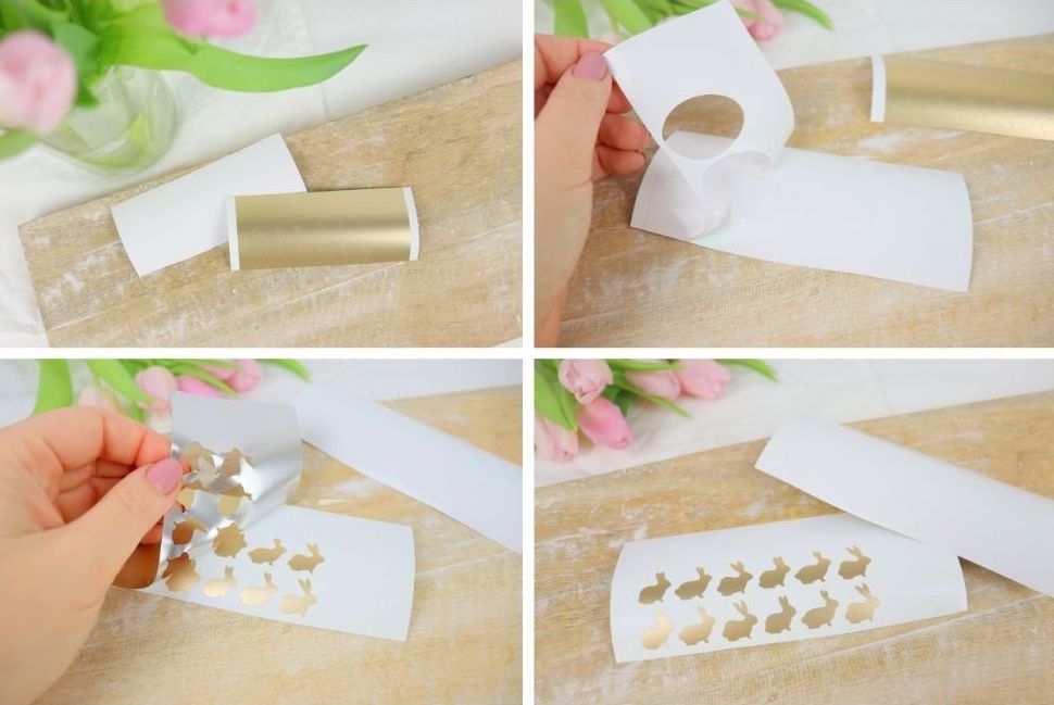 - Für dieses DIY habe ich die Vinylfolie in Schichten geklebt. Die Vorlage habe ich so erstellt, dass erst die Eier ausgeschnitten werden und dann die Hasen.