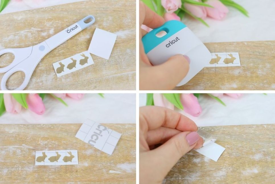 - Schneidet also zunächst eure Eier in eurer Wunschfarbe aus. Ich habe dafür die Cricut Joy Smart Vinyl Permanent Folie in weiß verwendet. Danach geht es mit den Hasen weiter. Dafür habe ich die goldene Vinylfolie verwendet.