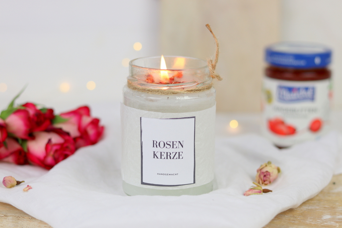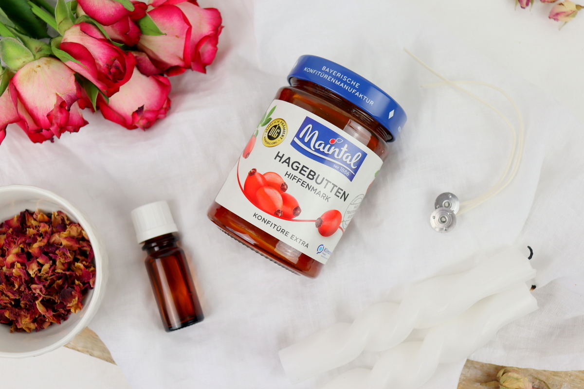 Ich liebe es Kerzen zu gießen. Als Kind habe ich mich fast täglich auf mein Fahrrad gesetzt und bin ein paar Kilometer zu Ilse gefahren. Ilse hatte ein Kerzenhaus und man konnte bei ihr Kerzen ziehen und gießen. Ich habe es geliebt, zu ihr zu fahren, der Geruch von dem flüssigen Kerzenwachs, die tollen Gespräche mit ihr, kreativ zu sein, in ihrem kleinen Shop zu stöbern und mit ihren unzähligen Tieren zu spielen.Wenn ich jetzt Kerzen gieße und den Geruch von geschmolzenen Wachs in der Nase habe, muss ich immer genau daran denken. Kerzen gießen ist einfach unglaublich entspannend für mich. Habt ihr ein Bastelmaterial oder eine Basteltechnik, die euch total entspannen lässt?Diesen wundervollen Beitrag habe ich mir gemeinsam mit Maintal Konfitüren und ihrer leckeren Hagebutten-Konfitüre extra ausgedacht. Diese durfte ich euch auch bei unseren leckeren Blätterteig-Osterhasen vorstellen. Wer den Beitrag verpasst haben sollte, sollte unbedingt >>hier<< vorbei schauen. Und wer den Beitrag mit dem Makramee Windlichtern verpasst hat, unbedingt >>hier<<! Unten erfahrt ihr noch mehr über die leckere Hagebutten-Konfitüre!DIY Anleitung - selbstgemachte Kerze im Einmachglas aus WachsrestenJetzt will ich euch erstmal verraten, wie ihr Kerzen aus Wachsresten selber gießen könnt!