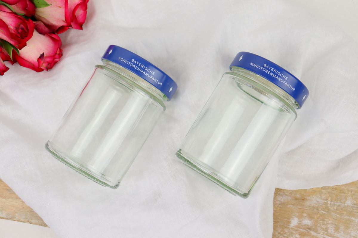 1. Verputzt zuerst eure Konfitüre und wascht die Gläser ordentlich aus. Ich lege meine Konfitürengläser immer für 30 Minuten in heißes Wasser mit etwas Spülmittel. So lässt sich das Etikett auch leicht entfernen.