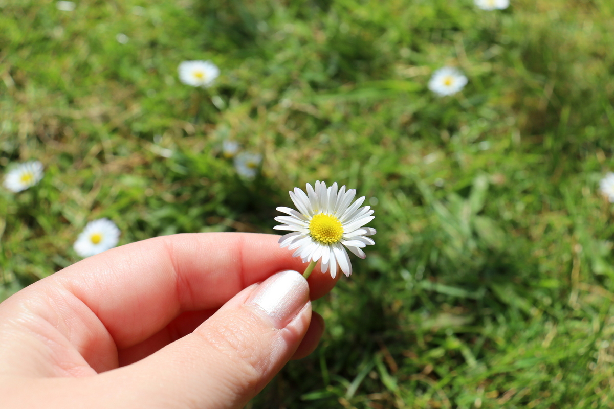 - Pflückt euch zunächst ein paar Gänseblümchen direkt unter der Blüte ab. Wenn ihr die Möglichkeit habt, pflückt die mit den rosanen Spitzen. Diese enthalten Anthocyane.