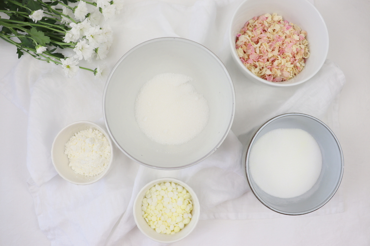 - Gebt zunächst Natron, Zitronensäure, Stärke und eure getrockneten Blütenblätter in eure Schüssel.