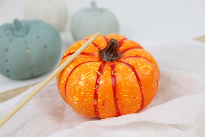 - Nun geht es für beide weiter. Diejenigen mit dem Plastikkürbis schnappen sich eine Bohrmaschine und z.B. einen Holzbohrer und bohren so viele kleine Löcher und Muster in den Kürbis, wie sie schön finden. Für die Styroporkürbisse habe ich einen Holzstab verwendet. Damit kann man einfach Löcher in den Kürbis stechen.