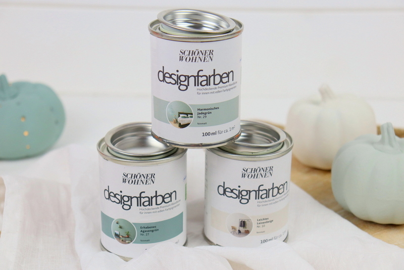 Als ich für eine andere Dekoidee los war, um Baby Boo und Blue Doll Kürbisse als Deko zu kaufen, wusste ich auch welche Farben meine Kürbis Laternen bekommen sollten, da ich das Grün von den beiden Kürbisarten so schön finde. Als ich die Kürbisse in der Hand hatte, fiel mir auch wieder ein, dass ich noch kleine Tester von SCHÖNER-WOHNEN-Farbe zu Hause hatte, die perfekt für mein jetziges Projekt passen würden.