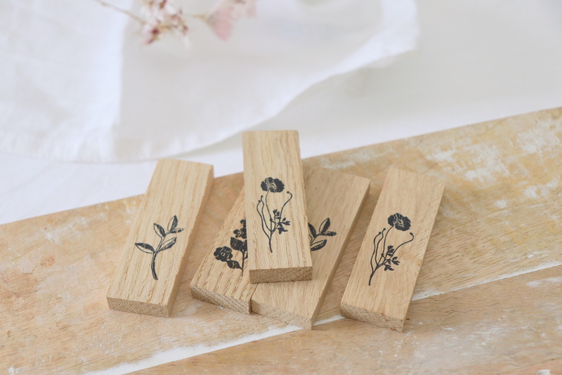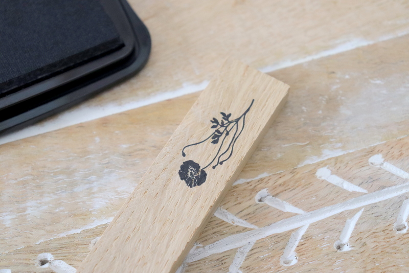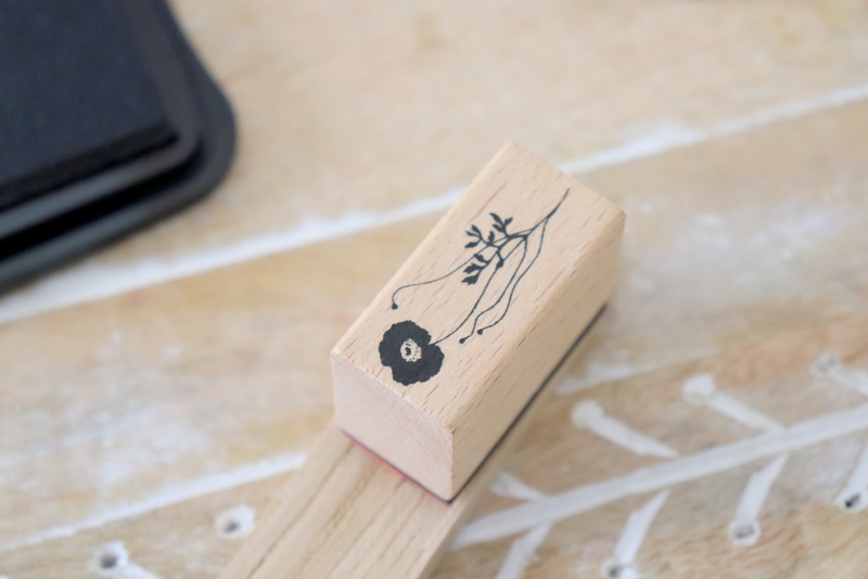- Ich habe Blumen-Stempel verwendet. Diese habe ich mit dem Stiel nach unten und der Blüte zur Mitte des Klötzchens gestempelt.