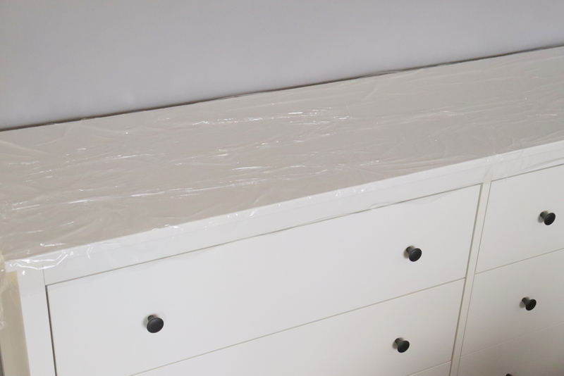 - Als erstes starten wir wieder mit meinem super Trick der Klarsichtfolie. Wobei es der Trick von meinem Mann war für die Fensterbänke. Ich habe ihn nur geklaut. 😀 Also Frischhaltefolie auf den Schrank, so kleben eure Klötzchen später nicht am Schrank fest.