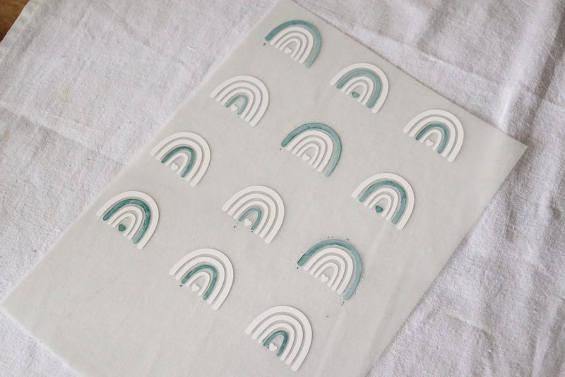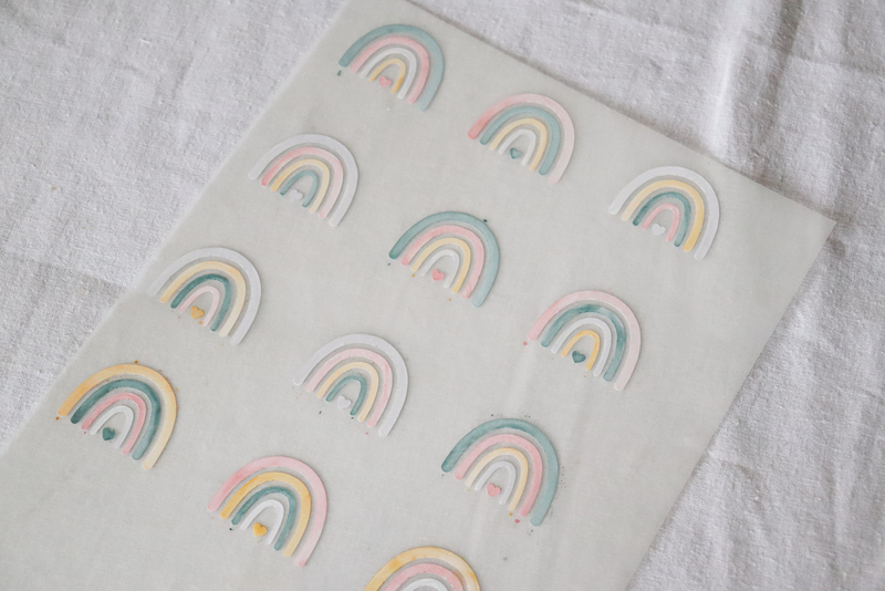 8. Wenn eure Aquarellfarbe getrocknet ist, klebt ihr eure POLI-TACK Transferfolie 870 auf eure Regenbögen.