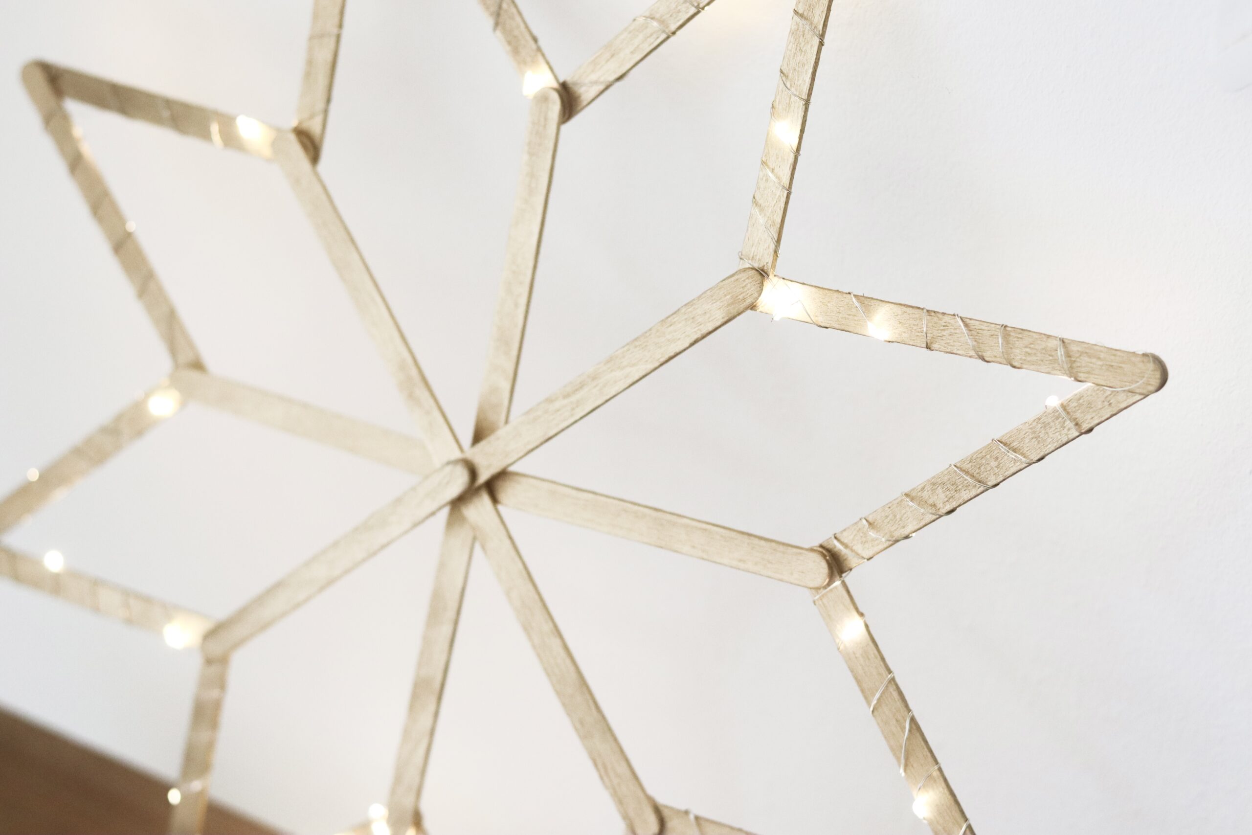 Zum Schluss kannst du eine kleine LED-Lichterkette um den Stern wickeln. Das gibt deinem DIY nicht nur das gewisse Etwas, sondern sorgt auch für ein wunderschönes, warmes Licht im Raum.